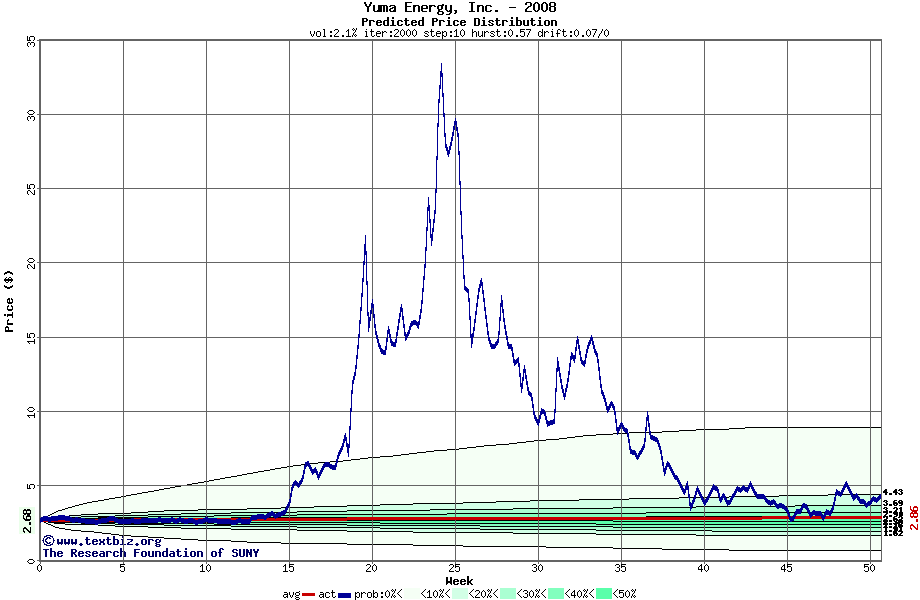 The high to date and low to date prices of the stock plotted against a random walk model for 2008 (what's this?).