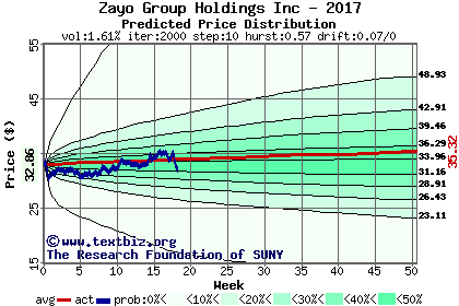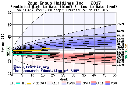 The high to date and low to date prices of the stock plotted against a random walk model for 2017 (what's this?).