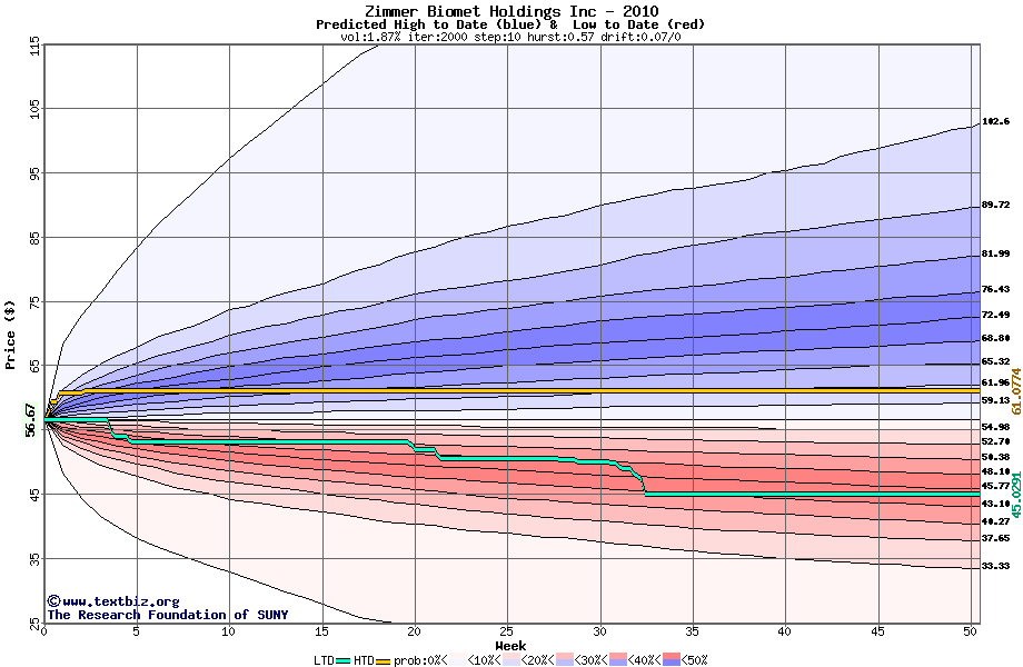 The high to date and low to date prices of the stock plotted against a random walk model for 2010 (what's this?).