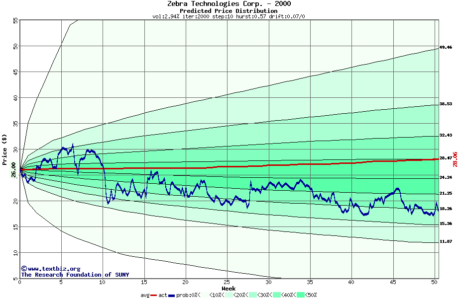 The following graph plots the year-to-date performance of the stock for 2000 compared to the probability calculated by a random walk model.