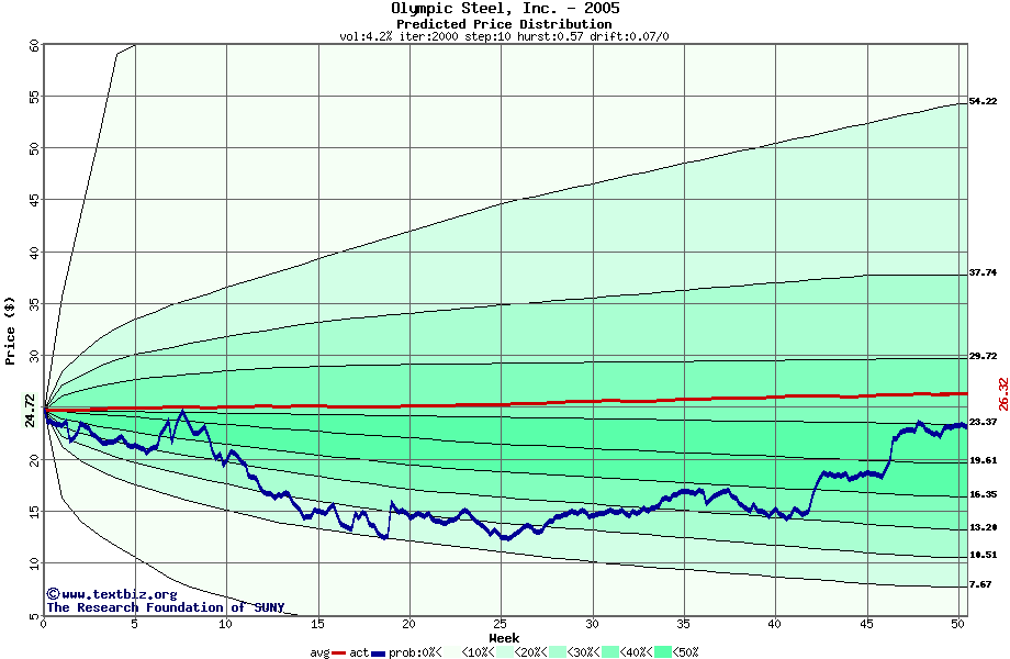 The following graph plots the year-to-date performance of the stock for 2005 compared to the probability calculated by a random walk model.