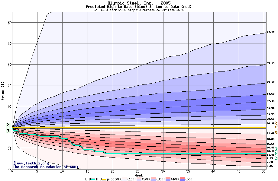 The high to date and low to date prices of the stock plotted against a random walk model for 2005 (what's this?).
