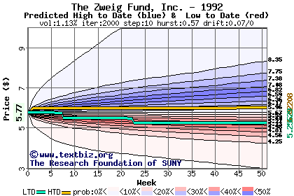 The high to date and low to date prices of the stock plotted against a random walk model for 1992 (what's this?).
