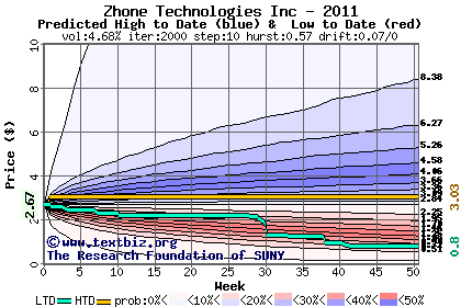 The high to date and low to date prices of the stock plotted against a random walk model for 2011 (what's this?).