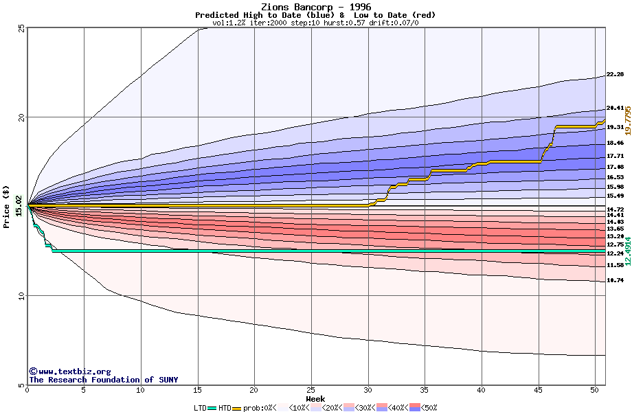 The high to date and low to date prices of the stock plotted against a random walk model for 1996 (what's this?).