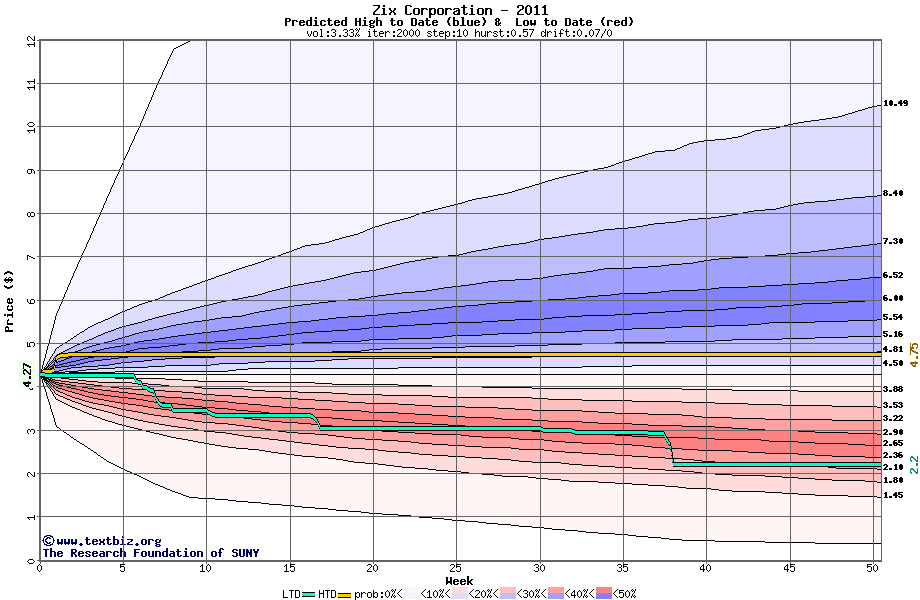 The high to date and low to date prices of the stock plotted against a random walk model for 2011 (what's this?).