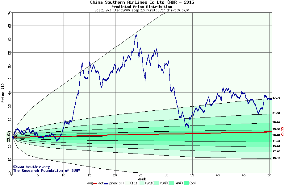 The following graph plots the year-to-date performance of the stock for 2015 compared to the probability calculated by a random walk model.