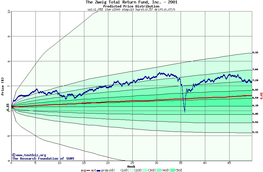 The following graph plots the year-to-date performance of the stock for 2001 compared to the probability calculated by a random walk model.