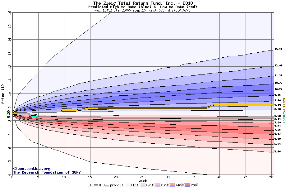 The high to date and low to date prices of the stock plotted against a random walk model for 2010 (what's this?).