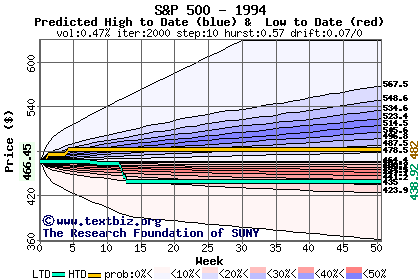 The high to date and low to date prices of the stock plotted against a random walk model for 1994 (what's this?).