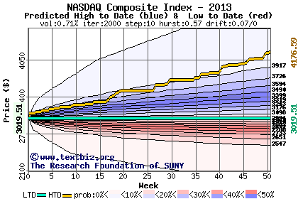 The following graph plots the year-to-date performance of the index for 2013 compared to the probability calculated by a random walk model.
