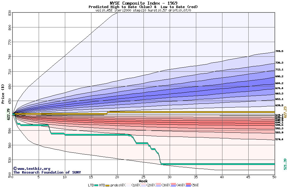 The following graph plots the year-to-date performance of the index for 1969 compared to the probability calculated by a random walk model.
