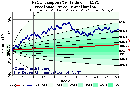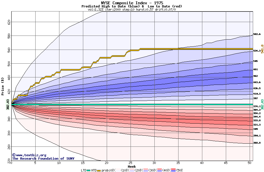 The following graph plots the year-to-date performance of the index for 1975 compared to the probability calculated by a random walk model.