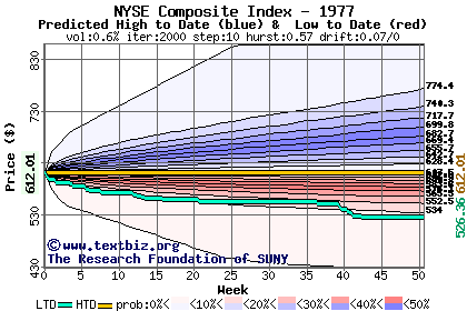 The high to date and low to date prices of the stock plotted against a random walk model for 1977 (what's this?).