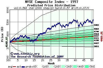 The following graph plots the year-to-date performance of the index for 1997 compared to the probability calculated by a random walk model.