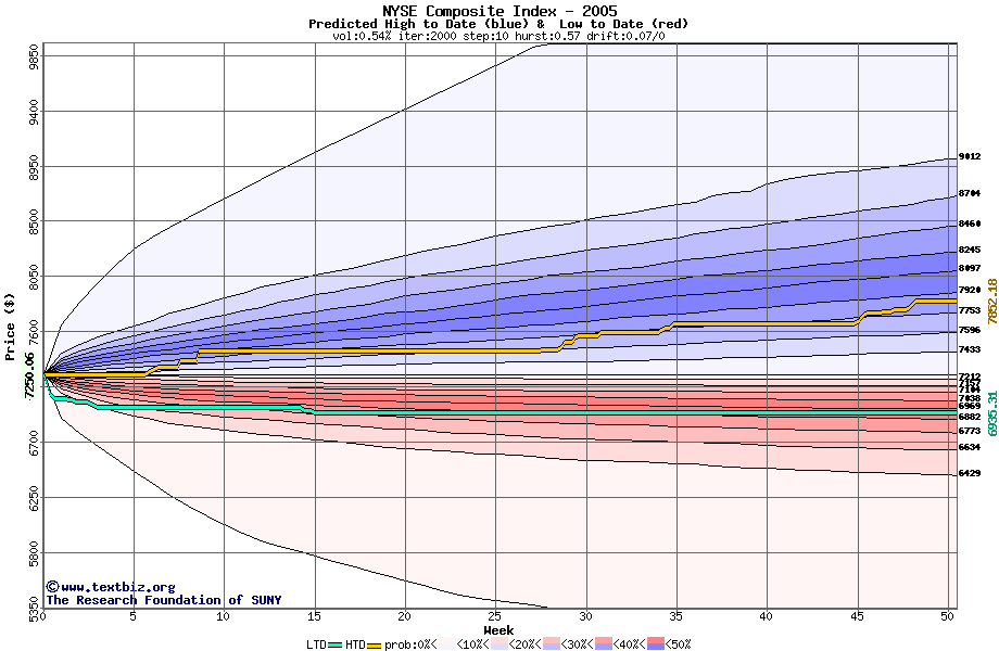 The following graph plots the year-to-date performance of the index for 2005 compared to the probability calculated by a random walk model.