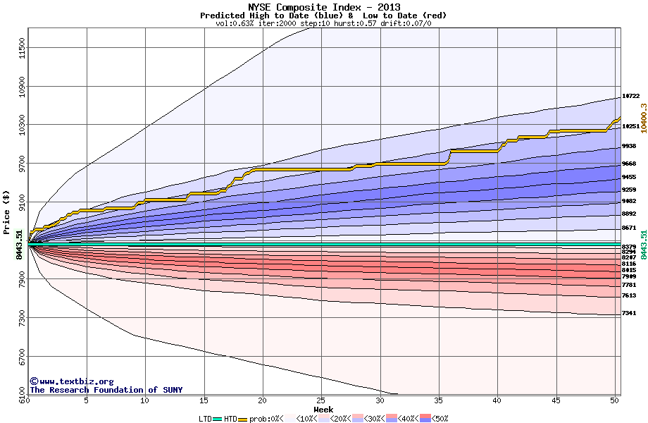 The following graph plots the year-to-date performance of the index for 2013 compared to the probability calculated by a random walk model.