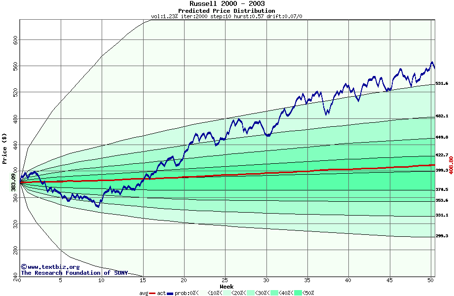 The following graph plots the year-to-date performance of the index for 2003 compared to the probability calculated by a random walk model.